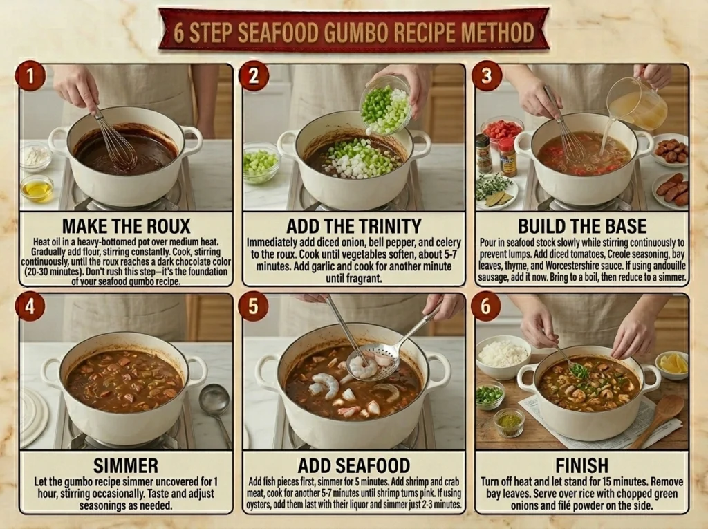 – Cook, stirring continuously, until the roux reaches a dark chocolate color (20-30 minutes). Don’t rush this step—it’s the foundation of your seafood gumbo recipe.