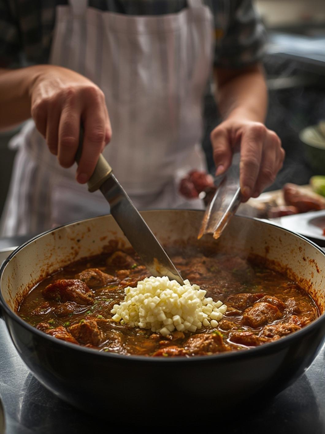 2. Prepare the holy trinity: Once your roux reaches the proper color, immediately add onions, bell peppers, and celery. Stir for 5-7 minutes until vegetables soften. Add garlic and cook for another minute.