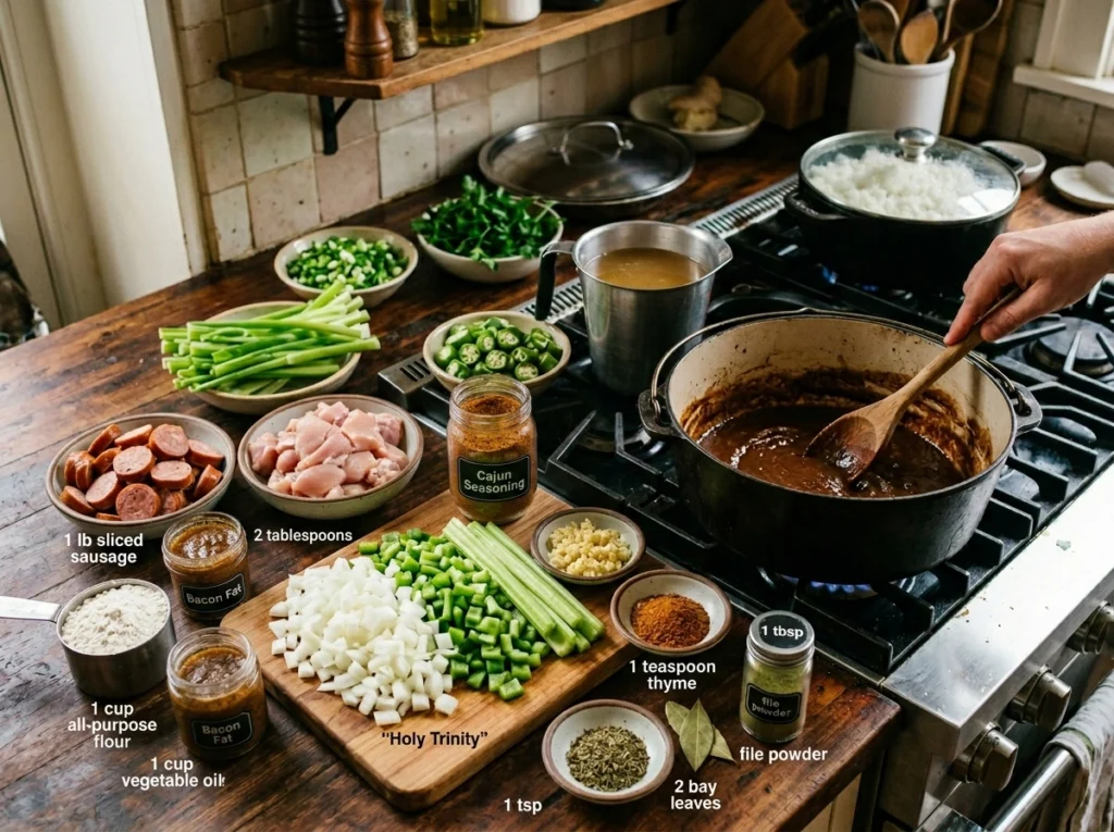 1. Make the roux: In a heavy-bottomed pot, heat oil over medium heat. Gradually whisk in flour and continue stirring constantly for 30-45 minutes until the roux reaches a deep chocolate brown color. Never stop stirring, as burned roux will ruin your cajun gumbo recipe.