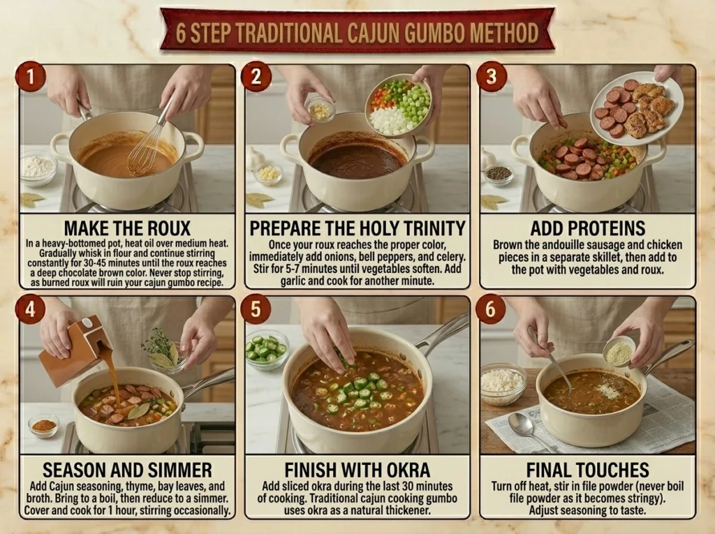 5. Finish with okra: Add sliced okra during the last 30 minutes of cooking. Traditional cajun cooking gumbo uses okra as a natural thickener.