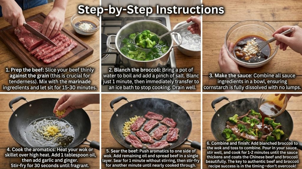 6. Combine and finish: Add blanched broccoli to the wok and toss to combine. Pour in your sauce, stir well, and cook for 1-2 minutes until the sauce thickens and coats the Chinese beef and broccoli beautifully. The key to authentic beef and broccoli recipe success is in the timing—don’t overcook!