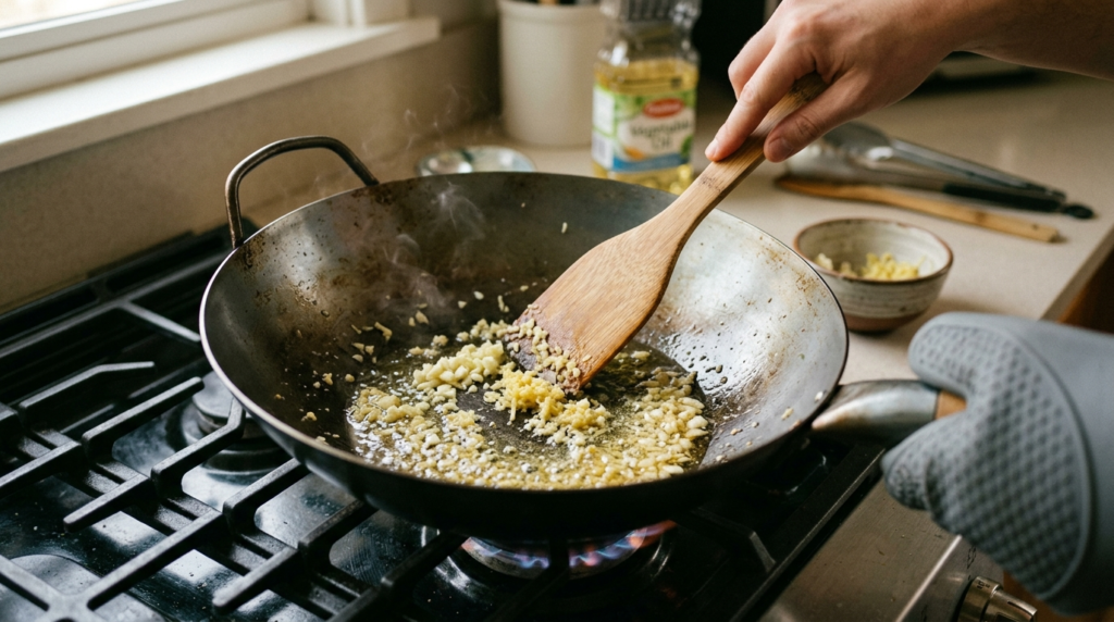 6. Stir-fry aromatics: Add the remaining oil to the wok. Add garlic and ginger, stir-frying for 30 seconds until fragrant.