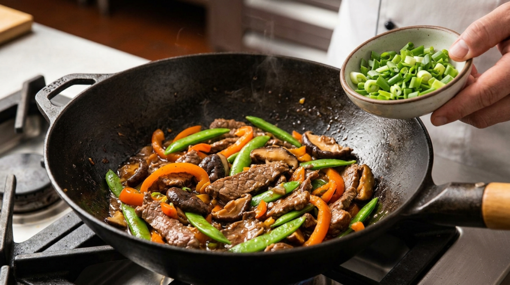 9. Finish: Add green onions and toss everything together. Remove from heat immediately to prevent overcooking.