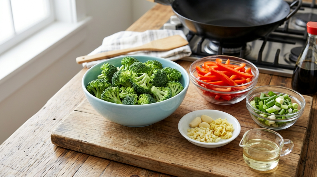 7. Add vegetables: Add broccoli and bell peppers, stir-frying for 1-2 minutes until crisp-tender.
