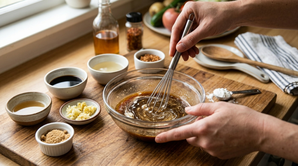 2. Make the sauce: Combine all sauce ingredients in a small bowl, making sure the cornstarch is fully dissolved. Set aside.