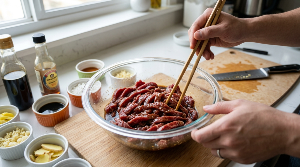1. Prepare the beef: Slice the beef against the grain into thin strips (about ¼-inch thick). Place in a bowl and add the marinade ingredients. Mix well and let sit for at least 15 minutes or up to 1 hour.