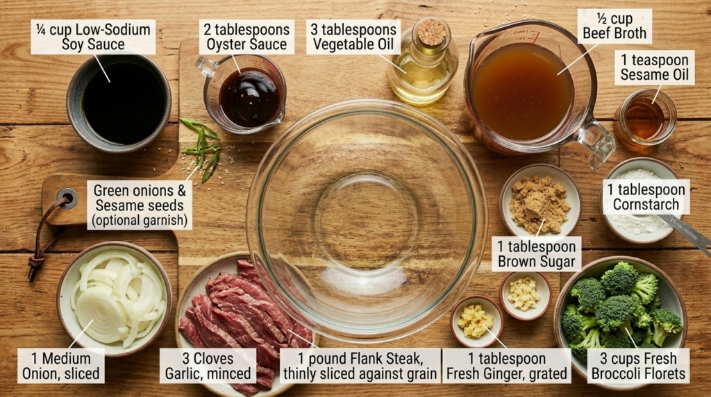 2. Make the sauce: In a bowl, whisk together soy sauce, oyster sauce, brown sugar, cornstarch, beef broth, and sesame oil until smooth. Set aside.