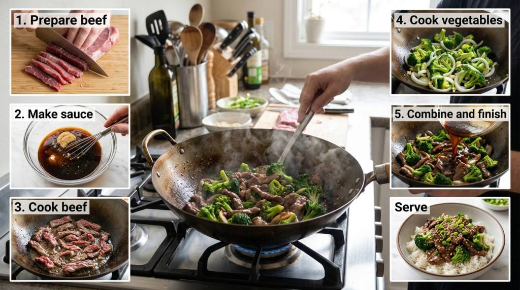 5. Combine and finish: Return beef to the wok. Pour the sauce over everything and stir continuously. Cook for 1-2 minutes until the sauce thickens and coats everything nicely. This beef and broccoli recipe comes together quickly at this stage, so stay attentive.