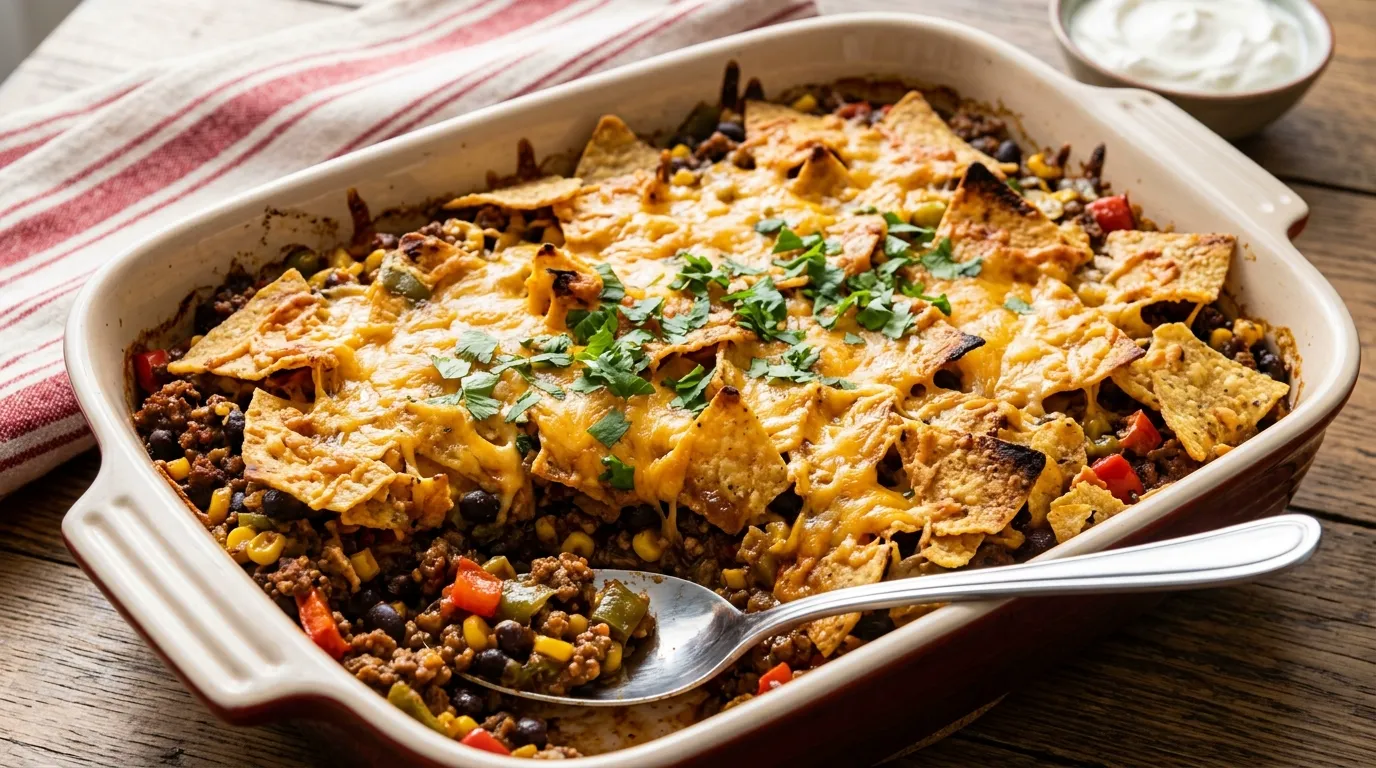 This casserole offers a balanced nutritional profile with protein from the ground beef, fiber from beans and vegetables, and energy from the cheese and chips. One serving provides approximately 380 calories with 25g protein, making it a substantial meal. The combination of vegetables adds essential vitamins and minerals, while using lean ground beef reduces fat content without sacrificing flavor.