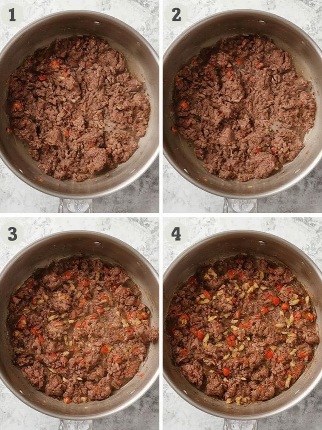 2. Brown the ground beef in a large skillet over medium-high heat, breaking it apart with a wooden spoon as it cooks (about 5-7 minutes). Drain excess fat if necessary.