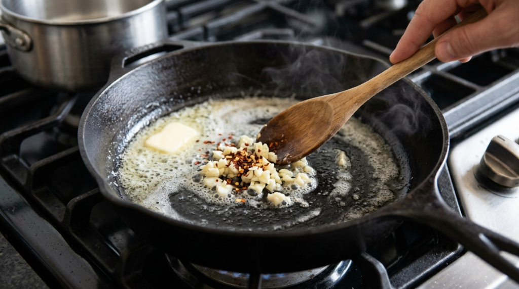 5. In the same skillet, add remaining butter and reduce heat to medium-low. Add minced garlic and red pepper flakes, cooking for 30 seconds until fragrant but not browned.