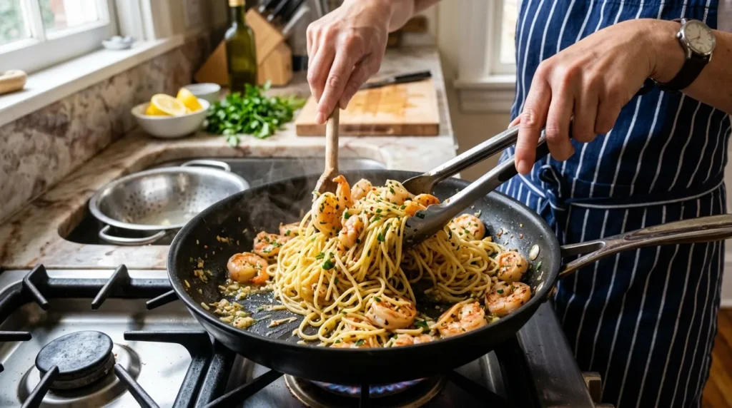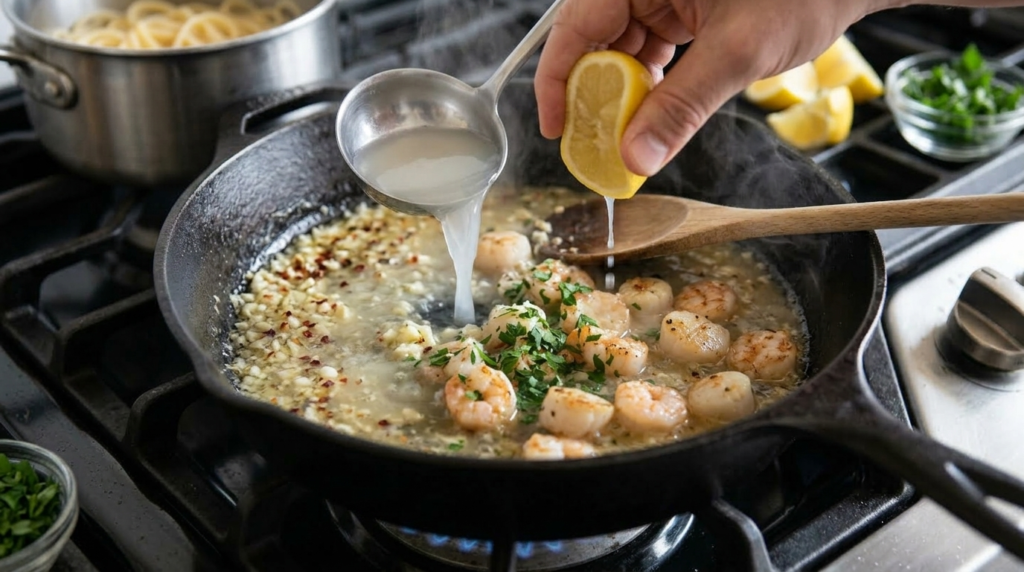7. Add lemon juice and a splash of the reserved pasta water to create a silky sauce. The starch in the pasta water helps the sauce cling beautifully to the seafood pasta recipes and elevates seafood pasta dishes to restaurant quality.