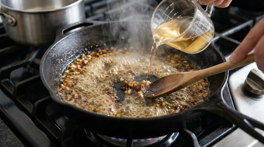 6. Pour in the white wine or broth to deglaze the pan, scraping up any flavorful bits from the bottom. Let it reduce by half, about 2 minutes.