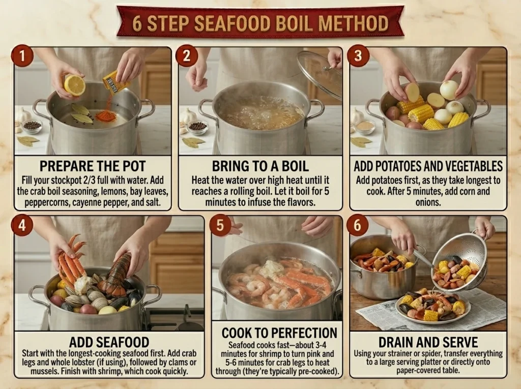 3. Add potatoes and vegetables: Add potatoes first, as they take longest to cook. After 5 minutes, add corn and onions. The layering of ingredients is crucial to any crab boil ingredients approach, ensuring each component is perfectly cooked in your crab boil recipe.