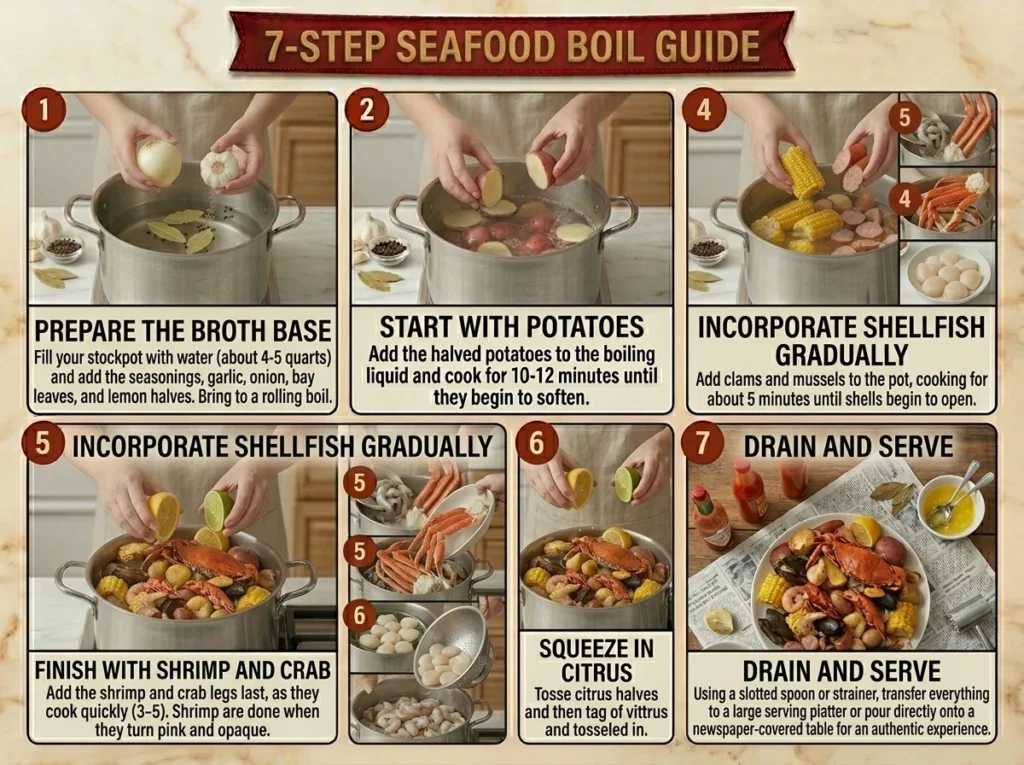 5. Add seafood strategically: Add the seafood in order of cooking time: crab legs and lobster first (5-7 minutes), followed by crawfish if using (2-3 minutes), then clams/mussels (until they open, about 2-3 minutes), and finally shrimp (2-3 minutes until pink).