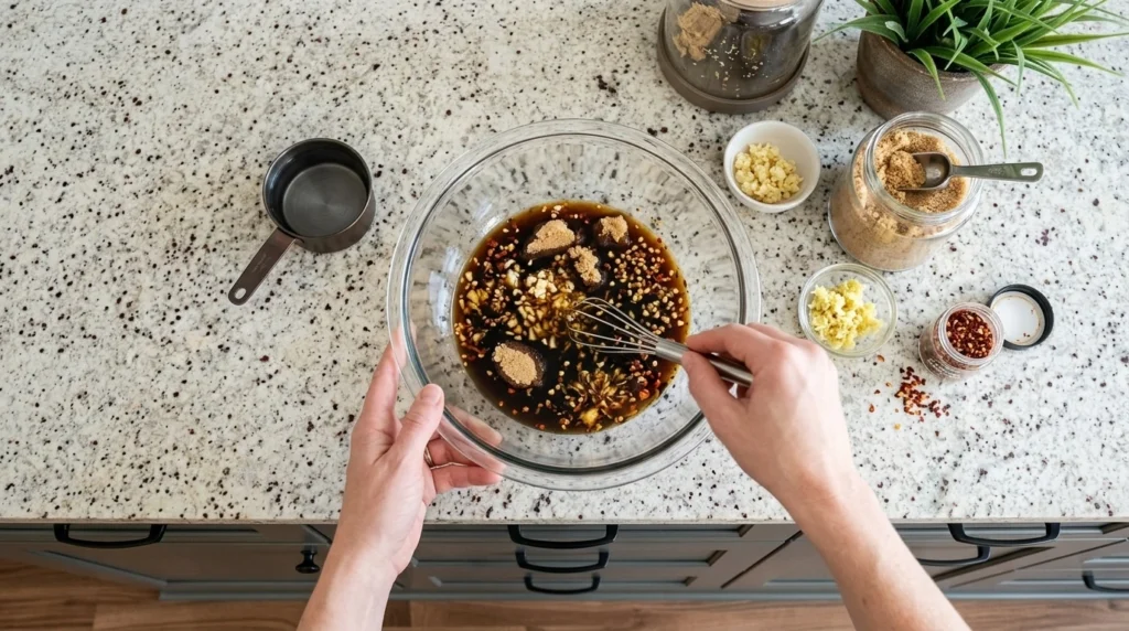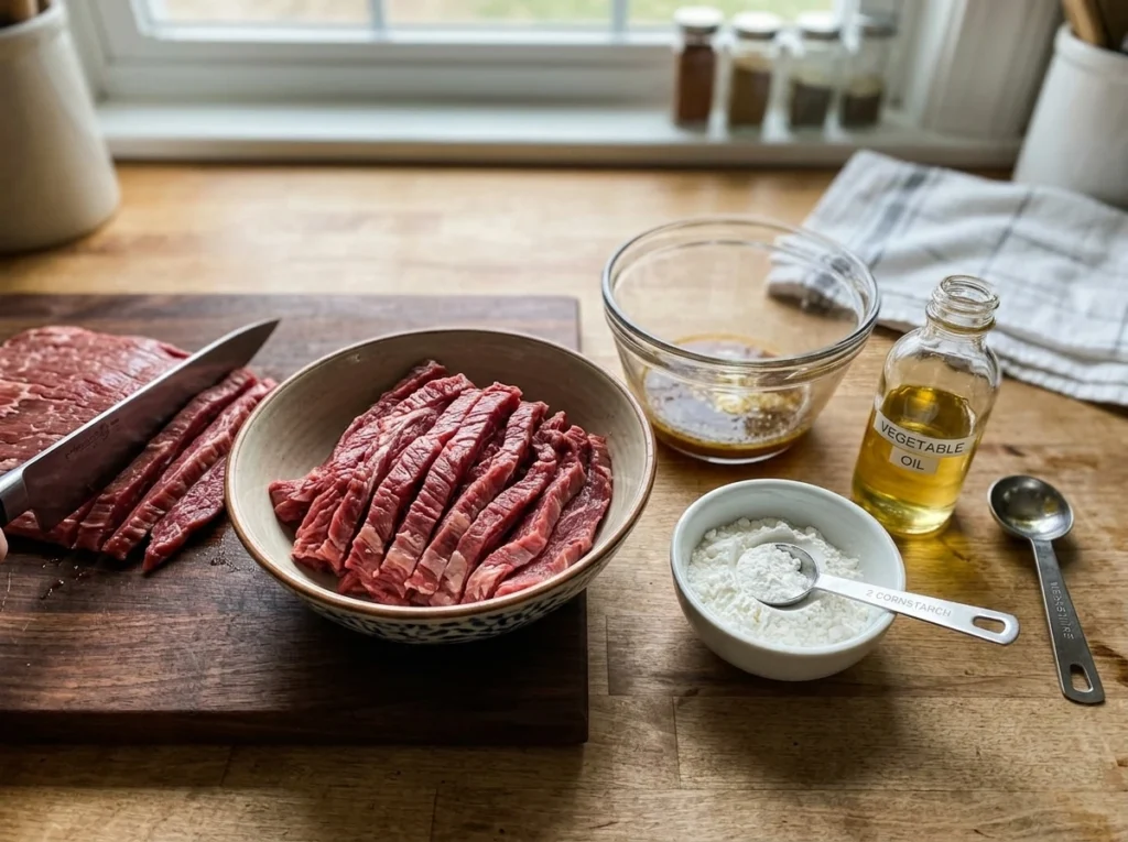 Freeze the beef for 20 minutes to firm it up. This makes it much easier to achieve those signature thin sliced beef cuts that are essential for a proper Mongolian beef recipe. Using a sharp knife, slice against the grain into 1/4-inch thick pieces. Proper thin sliced beef should be almost translucent and uniform in thickness for even cooking.