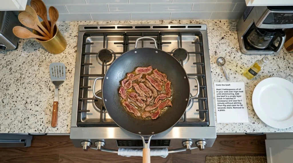 Heat 2 tablespoons of oil in your wok over high heat until shimmering. Add the thin sliced beef in a single layer (cook in batches if necessary) and sear for 1 minute without stirring. Then flip and cook for 30 seconds more. Remove to a plate. High heat is crucial — it sears the thin sliced beef quickly without overcooking it.